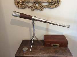 A very rare nine sided marine telescope made by Isaac Bradford London.Reverse taper form. Isaac Bradford worked from Bell Dock and later with his Son from 136 Minories London. The silver plated (on copper) fittings sets this telescope apart and it was probably made for a person of some standing. The lenses appear fine and it has good magnification. The mahogany barrel being NiNE sided is unusual as most if you can find one are either eight or 10 sided. The barrel has some minor age cracking but these are of little consequence. original silver plated objective lens cap and working eyepiece shutter. A real collectors or museum piece.